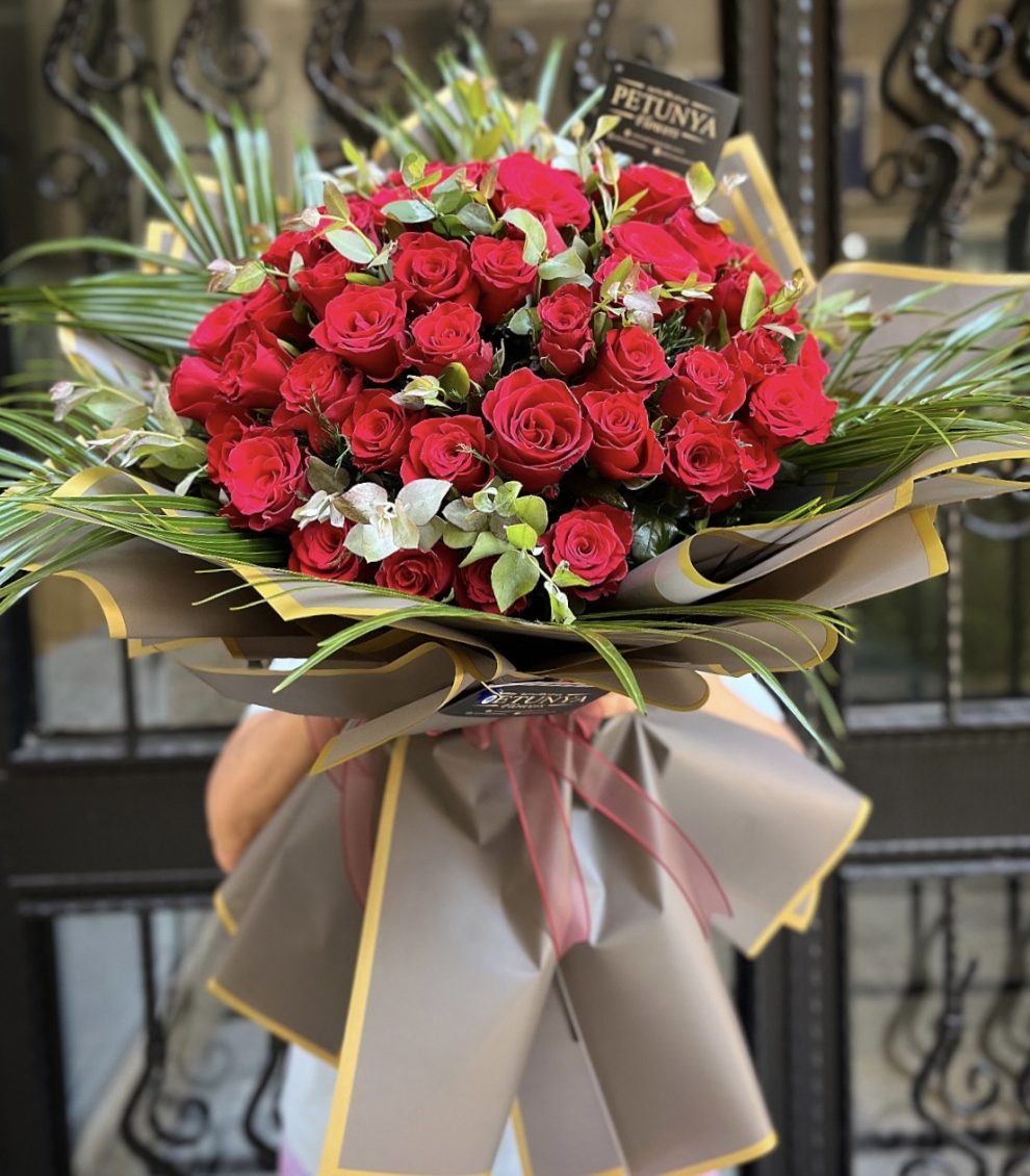 51 adet kaliteli kırmızı gülden oluşan şık buket.