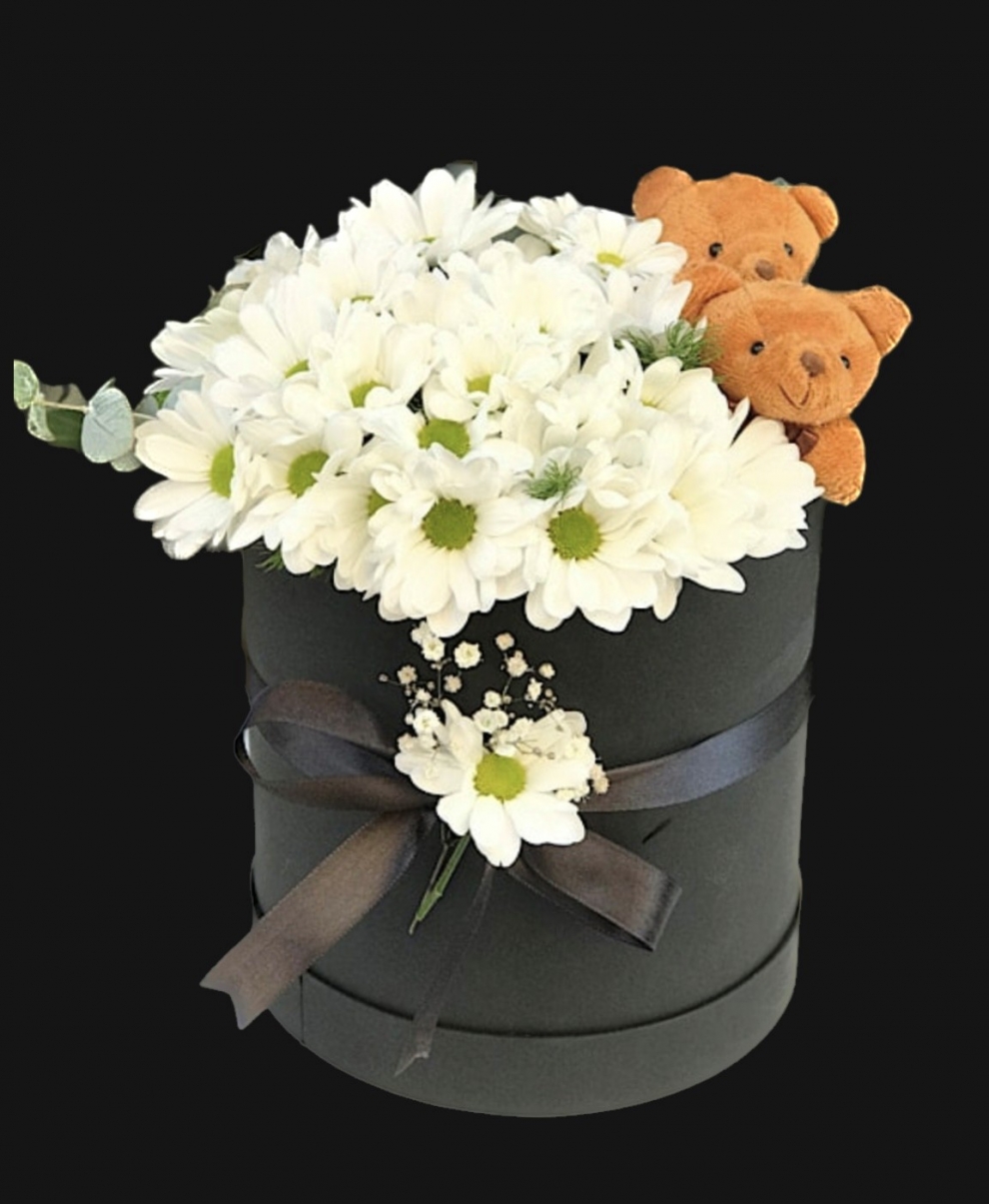 Kutuda beyaz papatyalar ve ayıcık.
