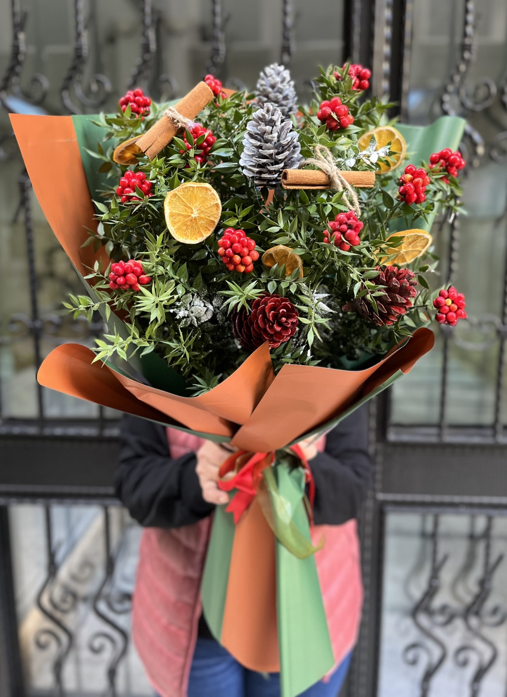 Ürünümüz 12 adet kokina(yılbaşı çiçeği) kozalak,portakal kabukları ve tarçınlar ile süslenmiştir.