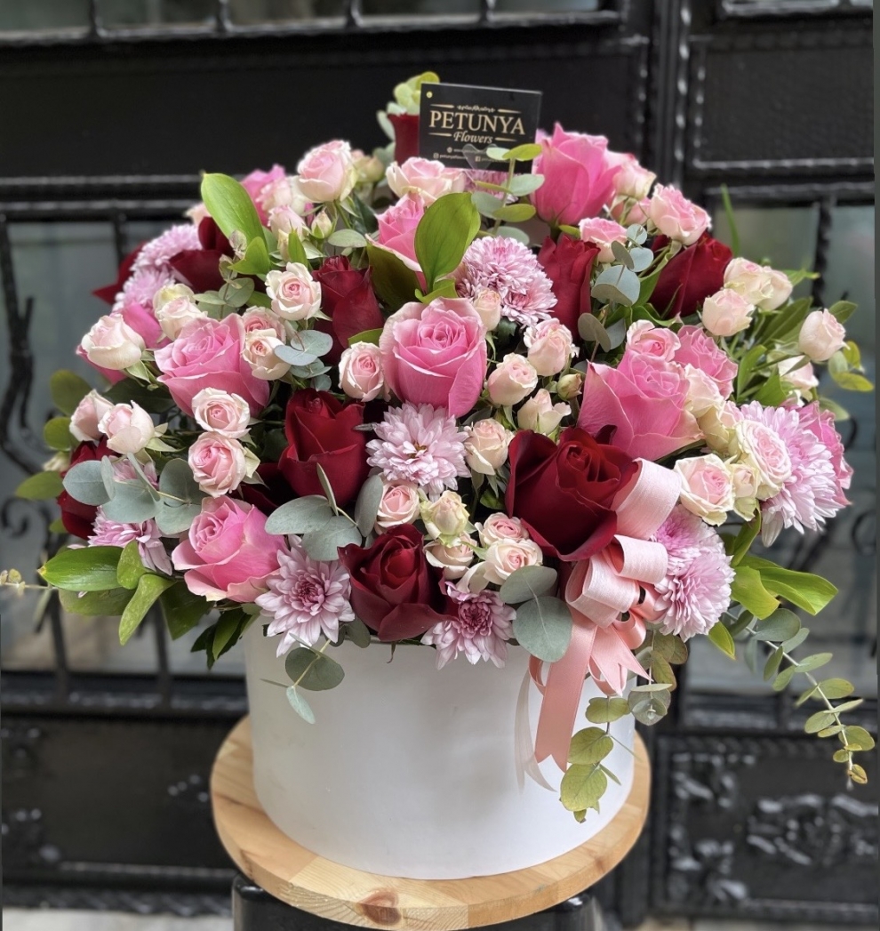 Kutuda pembe,kırmızı güller ve çeşitli garnitür(yeşilliklerden)oluşan Vip kutu çiçek aranjmanı.